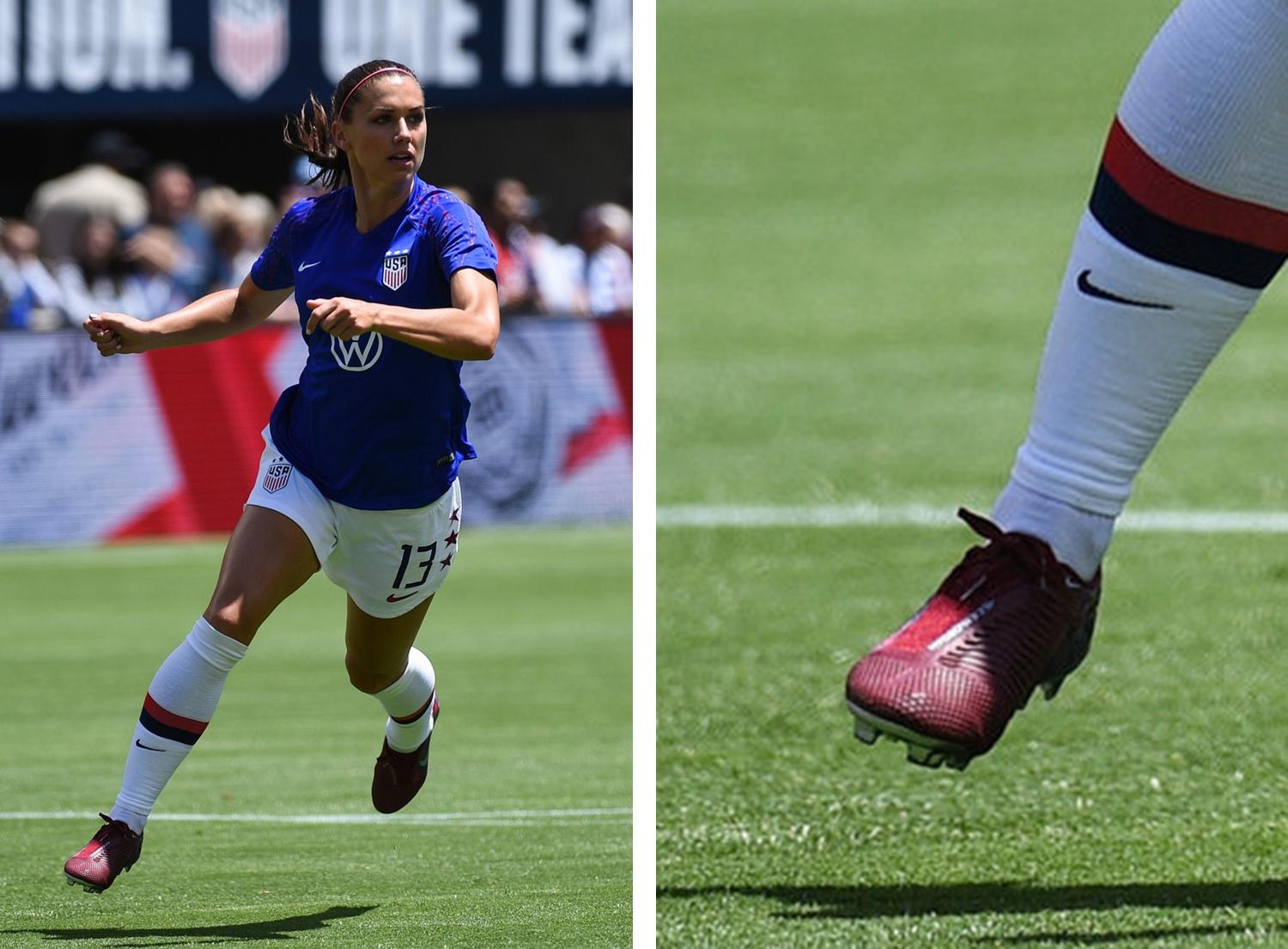 2019法国女足世界杯开赛在即,各支球队纷纷通过热身赛进行最后备战。美国女足在主场迎战南非女足。本场比赛,美国女足头号球星阿莱克斯·摩根上脚了耐克先前为庆祝攻入国家队百球特意打造的一双限量版Nike Phantom VNM Elite SE足球鞋。