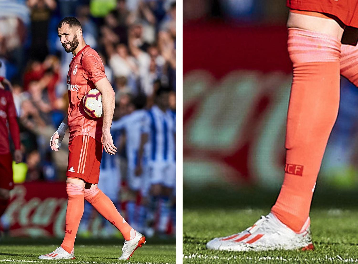 北京时间昨天凌晨结束的西甲第37轮的一场比赛中,客场作战的皇家马德里在先进一球的情况下被皇家社会逆转,最终客场1比3告负。本场比赛,此前一直穿着adidas adizero f50的本泽马终于换鞋了,拥有银色外观的全新adidas X 19.1 “302 Redirect”足球鞋成了他在场上的新搭档。