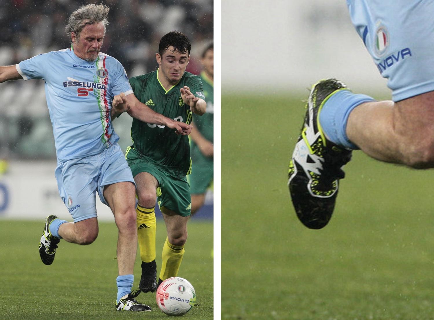 北京时间今天凌晨,一场名为“Partita del Cuore 2019”的慈善赛在尤文图斯主场安联竞技场打响。除了有C罗、托蒂、皮尔洛、布冯等球星参加外,还有职业车手与演艺界人士亮相本场比赛。意大利知名创作歌手尼科洛·法比也参加了本场比赛,他脚上的这双战靴引起了我们的兴趣,一双出自意大利本土运动品牌GIVOVA的足球鞋,并且还是AG版本。