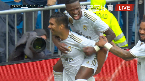 39分41秒,本泽马回到中场接应,然后分给右路的巴斯克斯;巴斯克斯再直塞到前场,维尼修斯前插后下底传中,卡塞米罗在39分50秒中路包抄破门,皇马3-0!