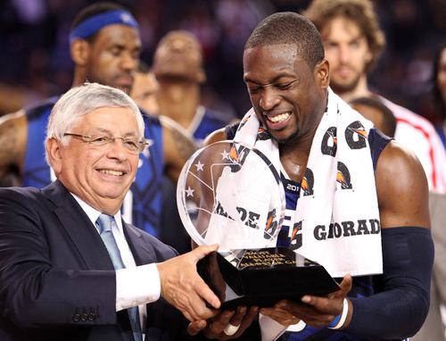 在2010年的全明星大赛上“闪电侠“韦德获得了生涯第一次也是唯一一次全明星mvp。他在比赛中出手16次命中了其中12个,狂砍28+6+11以精彩的表现征服了观众。图为韦德开心的从斯特恩手中接过mvp奖杯。