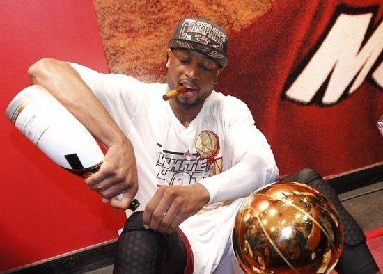 在2013年的NBA总决赛当中热火以4-3战胜马刺获得NBA总冠军这也是韦德的第三冠,我想韦德知道这个冠军的来之不易。在第六场人们都以为冠军已经属于马刺的时候,雷阿伦站了出来,用一记三分球将比赛拖入了抢七大战。热火众将心里都在默念:这个机会一定要好好把握!画面来到第四节还剩一分23秒,比分88-92 热火领先四分,马刺球权,马刺发边线球,然而韦德早已看穿一切,一个箭步将球抢断。可是由于用力过猛,韦德失去了重心。球在抢断后离他还有一定的距离,韦德几乎跪着过去将球控制住然后传给队友完成得分。让冠军稳稳的抓在了热火的手中。这也有了图中韦德用香槟浇灌他的膝盖的画面。