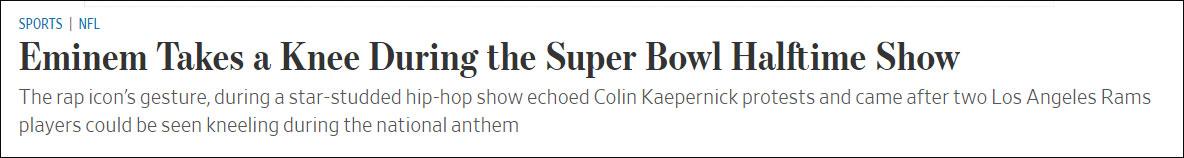 (观察者网讯)综合纽约时报、华尔街邮报、美国全国公共广播电台(NPR)等报道,近日,说唱歌手阿姆(Eminem)在“超级碗”比赛中场秀中单膝下跪,此举引发了美国国内一些讨论。有人认为,这位说唱偶像做出这一举动是在呼应曾效力洛杉矶公羊队的科林•卡普尼克(Colin Kaepernick)有关警察暴行和种族歧视的抗议。