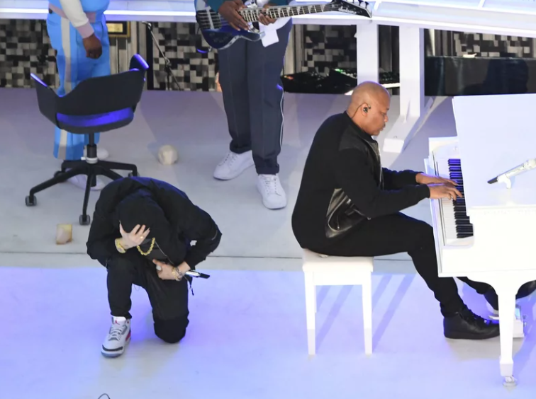 据了解,在本次“超级碗”比赛中,洛杉矶公羊队(Los Angeles Rams)与辛辛那提Bengals队(Cincinnati Bengals)的比赛以13比10领先。在中场秀结束时阿姆演唱完他的歌曲《lose yourself》后,低着头单膝跪地约50秒。