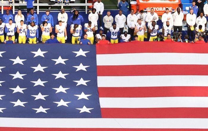 可以看到至少两名公羊队队员,特雷尔·伯吉斯和尼克·斯科特,在国歌响起时跪着。图自华尔街邮报