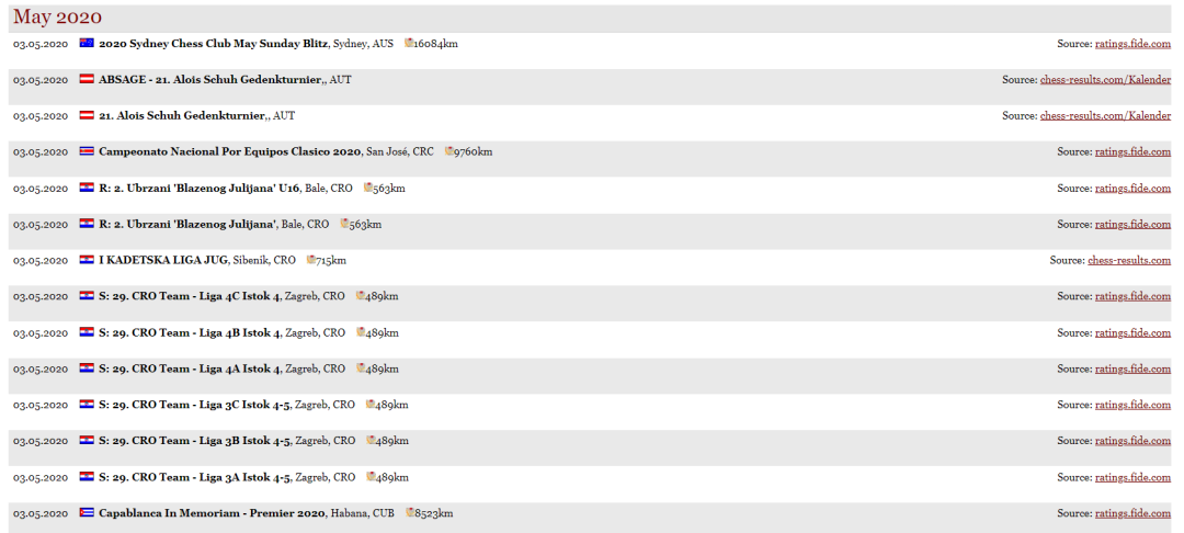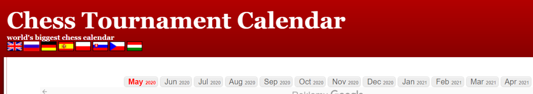 世界上最大的国际象棋锦标赛日历,汇总了全球一年内的国际象棋比赛信息,界面上以自然月划分时间选项,每条信息都简单明了的提供了比赛时间、地点、名称等信息,并注明信息来源。