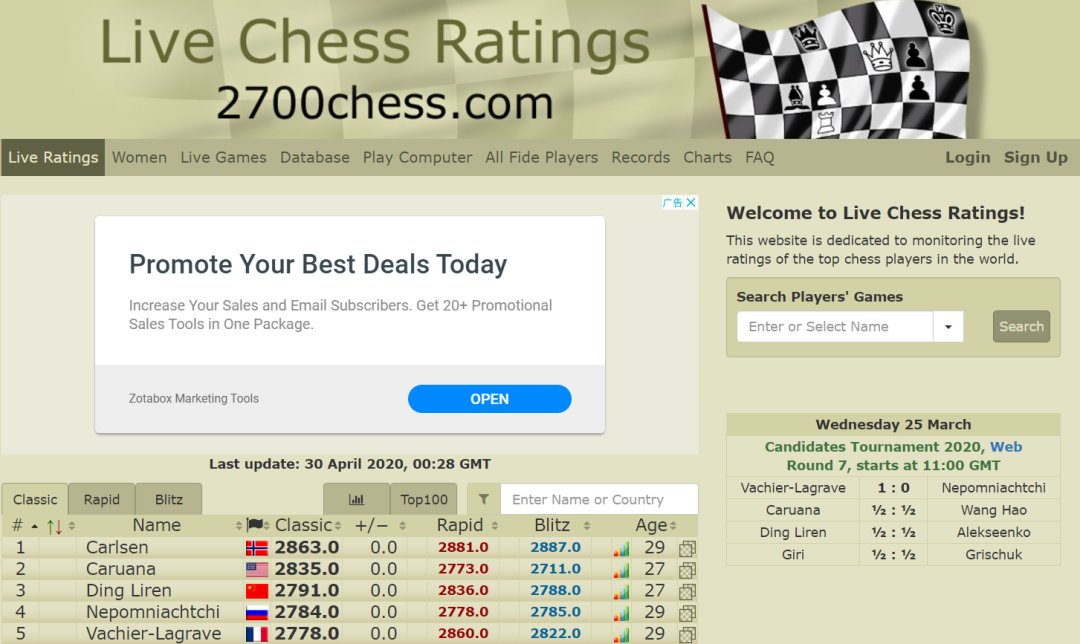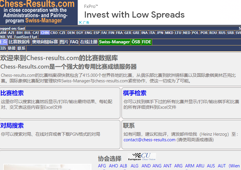 强大的专用比赛成绩服务器网站,其所包含的比赛档案包含了世界世界各地比赛的配对和成绩查询,网站同国际象棋比赛配对管理软件Swiss-Manager合作,对外发布全面完整的比赛信息,是查询棋手比赛成绩的好工具。
