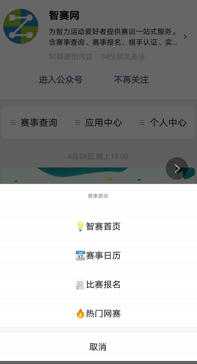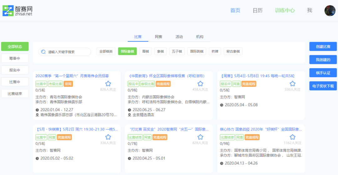 智力运动比赛管理平台,手机端关注智赛网的公众号,可以方便查看国内大部分国际象棋比赛日程,尤其是棋协大师以下级别的等级赛,基本都是在智赛网上显示报名。除国际象棋外,还有围棋,中国象棋,跳棋,五子棋等。