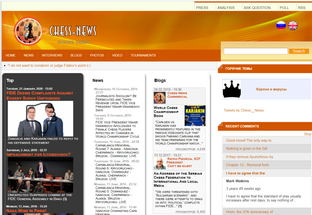 用俄文和英文报道国际象棋信息,涵盖国际象棋重大比赛、特级大师动态、国际等级分排名等,有自己的报道团队和独特视角的报道。