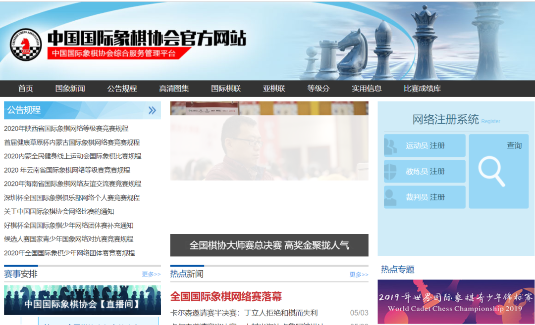 中国国际象棋协会综合服务管理平台(官网),中国国际象棋协会官方信息发布,国际象棋运动员、教练员、裁判员注册及查询,国际象棋赛事直播转播,国际象棋明星动态,棋谱、等级分查询