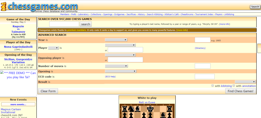 有关国际象棋战术训练、开局和残局分析、中局战略分析的大量深入浅出的文章,适合各种程度的国际象棋棋迷,是国际象棋棋迷们最喜爱的网站。