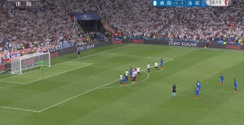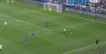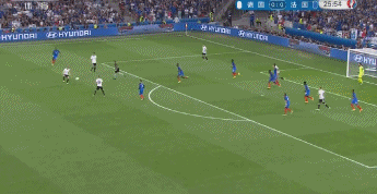 第36分钟,詹在禁区前防守时放倒了格里兹曼,送给法国一个位置极佳的任意球,并吃到黄牌。博格巴直接打门,球越过了人墙,但打得太正被诺伊尔得到。