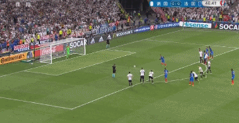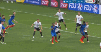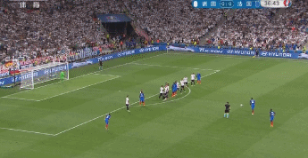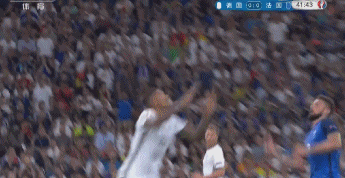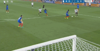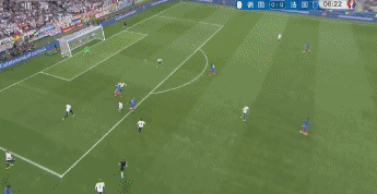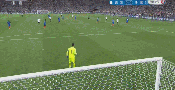 格列兹曼主罚,推射左路半高球,诺伊尔判断错了方向,法国1-0领先德国,上半场随即结束。