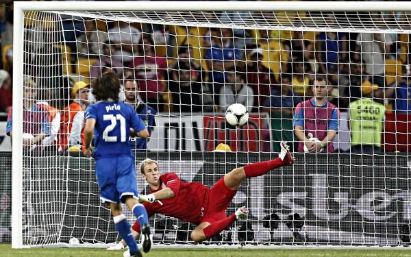 此前在大赛点球中6战1胜的英格兰碰上了7战2胜的意大利,两队踢出了一场精彩的0-0,不得不通过点球决胜。巴神面对曼城队友乔哈特诡异微笑,罚进首粒点球,但随后蒙托利沃踢偏,杰拉德和鲁尼先后命中,意大利1-2落后。危难时刻,皮尔洛经典勺子稳定军心,而英格兰的两个阿什利却先后罚丢,杨和科尔的点球先后被横梁和布冯拒绝。第5轮,迪亚曼蒂冷静命中,4-2!意大利赢了!英格兰欧洲杯点球3连败!