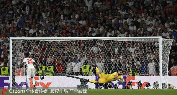 比赛进入残酷的点球大战。首轮,贝拉尔迪和哈里-凯恩双双射中,1-1;次轮,贝洛蒂射右下角被皮克福德扑出,马奎尔爆射右上角命中,1-2;第3轮,博努奇射中,拉什福德打中左侧立柱弹出,2-2;第4轮,贝尔纳代斯基罚入,桑乔射出的点球被唐纳鲁马扑出,3-2;第5轮,若日尼奥低射左下角被扑出,但唐纳鲁马又扑出萨卡射出的点球,3-2。意大利夺得本届欧洲杯冠军,这也是蓝衣军团继1968年夺冠之后,第二次问鼎欧洲杯。