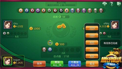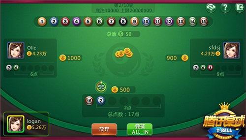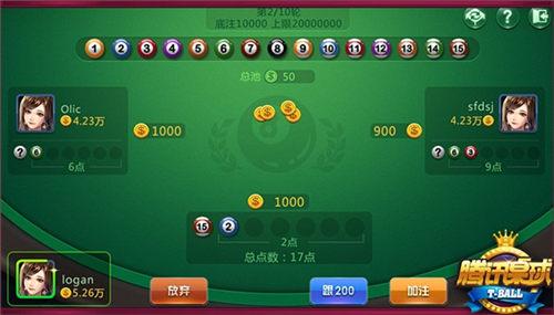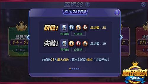《腾讯桌球》“幸运28”比赛开始时,系统会随机给每位玩家分配一颗私有球;球号1-10,不同玩家可能获得相同点数的私有球;私有球仅玩家自己可见。系统随机选择1位玩家进行首次下注,不同房间下注金额不同,下注后可获得1颗公开球,公开球所有玩家可见。