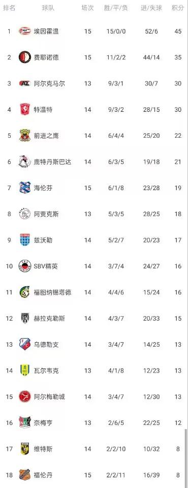 本场过后埃因霍温已经在本赛季保持15场荷甲全胜战绩,打进52球,仅失6球,净胜球高达46球,已领先次席的费耶诺德10分之多。