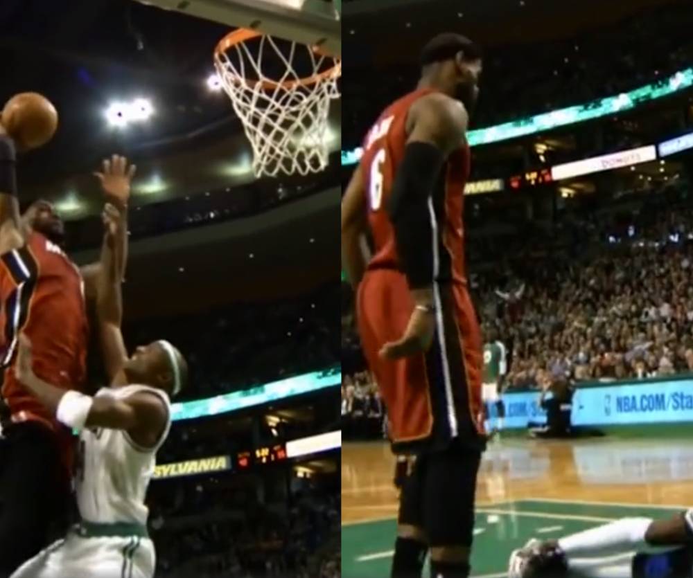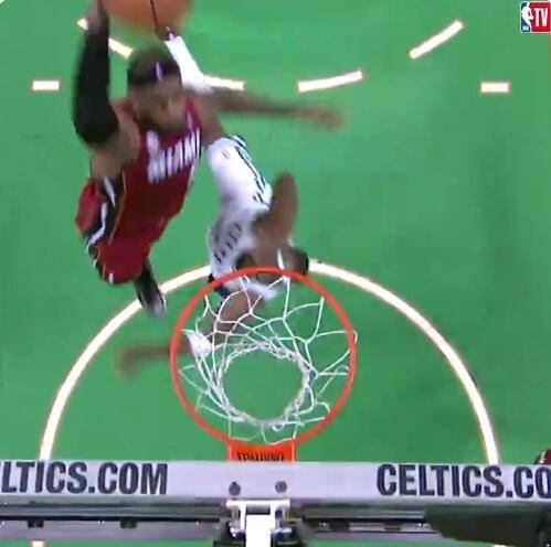 热火客场挑战凯尔特人,詹姆斯在反击中接科尔传球准备空接,杰森-特里起跳想要阻止詹姆斯,但和詹姆斯对抗之后被撞飞,随后詹姆斯完成单臂隔扣,裁判同时哨响2+1。