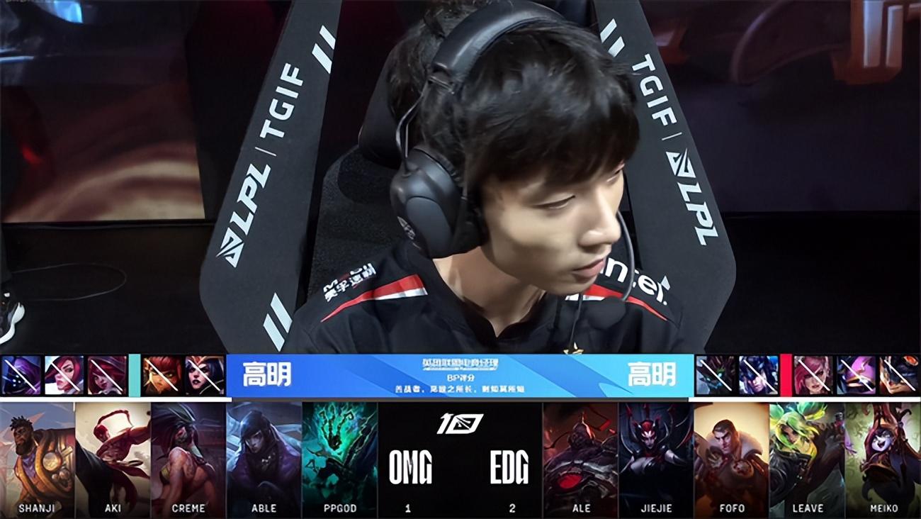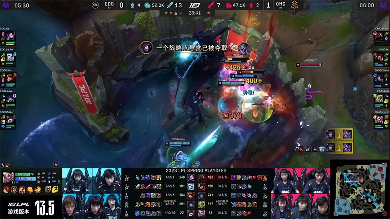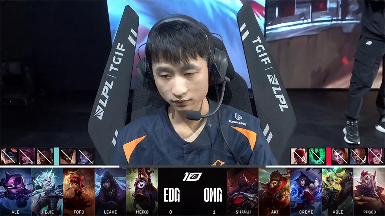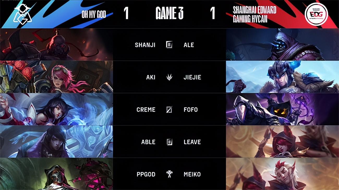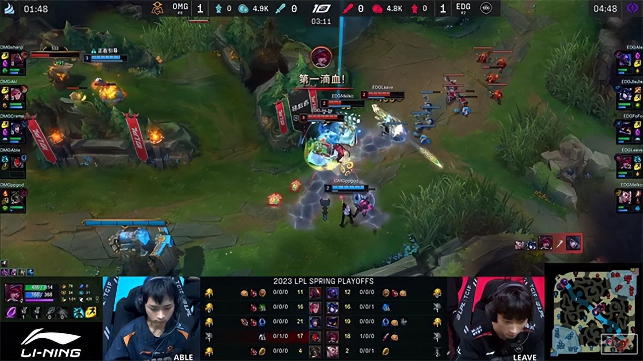 2023 LPL春季赛季后赛四强双败赛第一轮第二场对决,以常规赛第六身份一路黑马逆袭杀入四强的OMG战队即将迎来季后赛至今最为强大的对手EDG战队,两队都是历史渊源颇深的LPL老牌战队,如今在赛场相遇即将争夺晋级胜者组决赛的机会。而败者则将与BLG战队展开生死局较量。双方的硬实力与中期运营能力有所差距,但OMG强悍的团战操纵硬生生在第一局翻盘击败EDG先夺一分,EDG迅速冷静下来调整战术,开始主打下半区阻断OMG引以为豪的控龙打法,成功限制了OMG下路的发挥,最终实现让一追三,3-1战胜OMG挺进胜者组决赛。EDG将与JDG争夺第一张通往春季总决赛的门票。