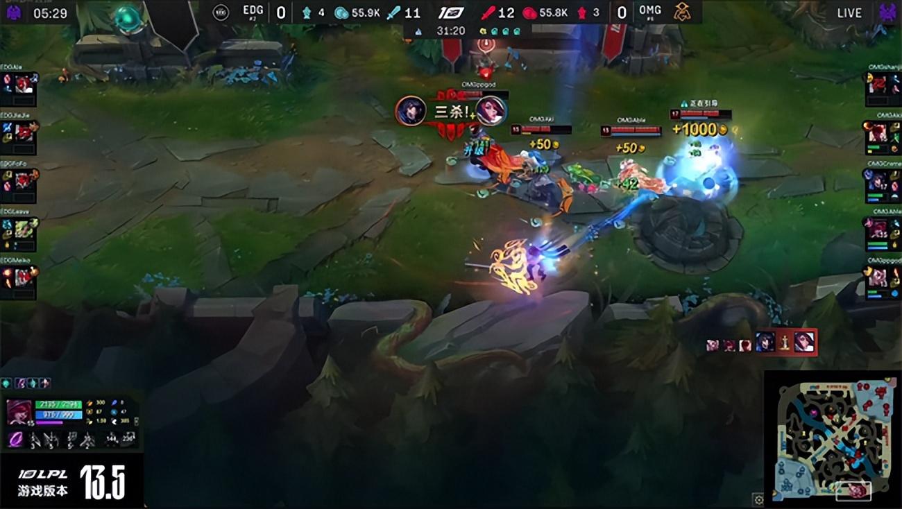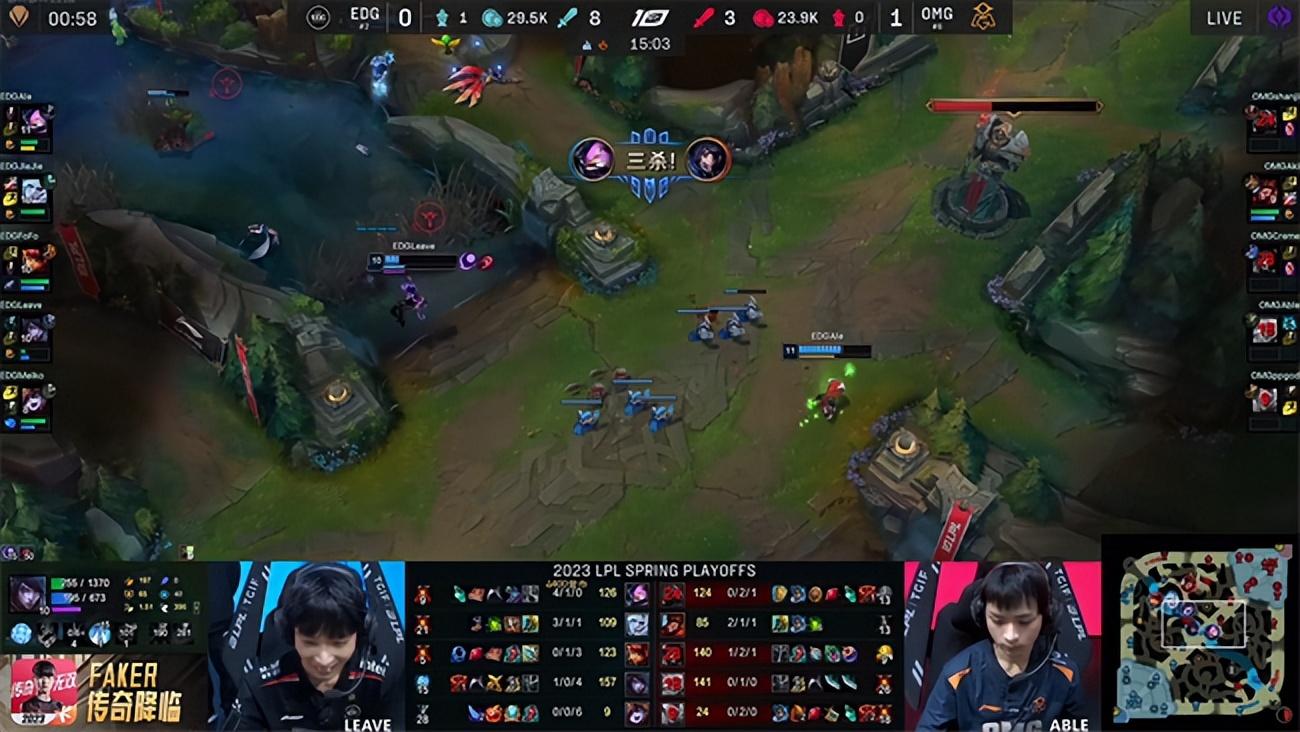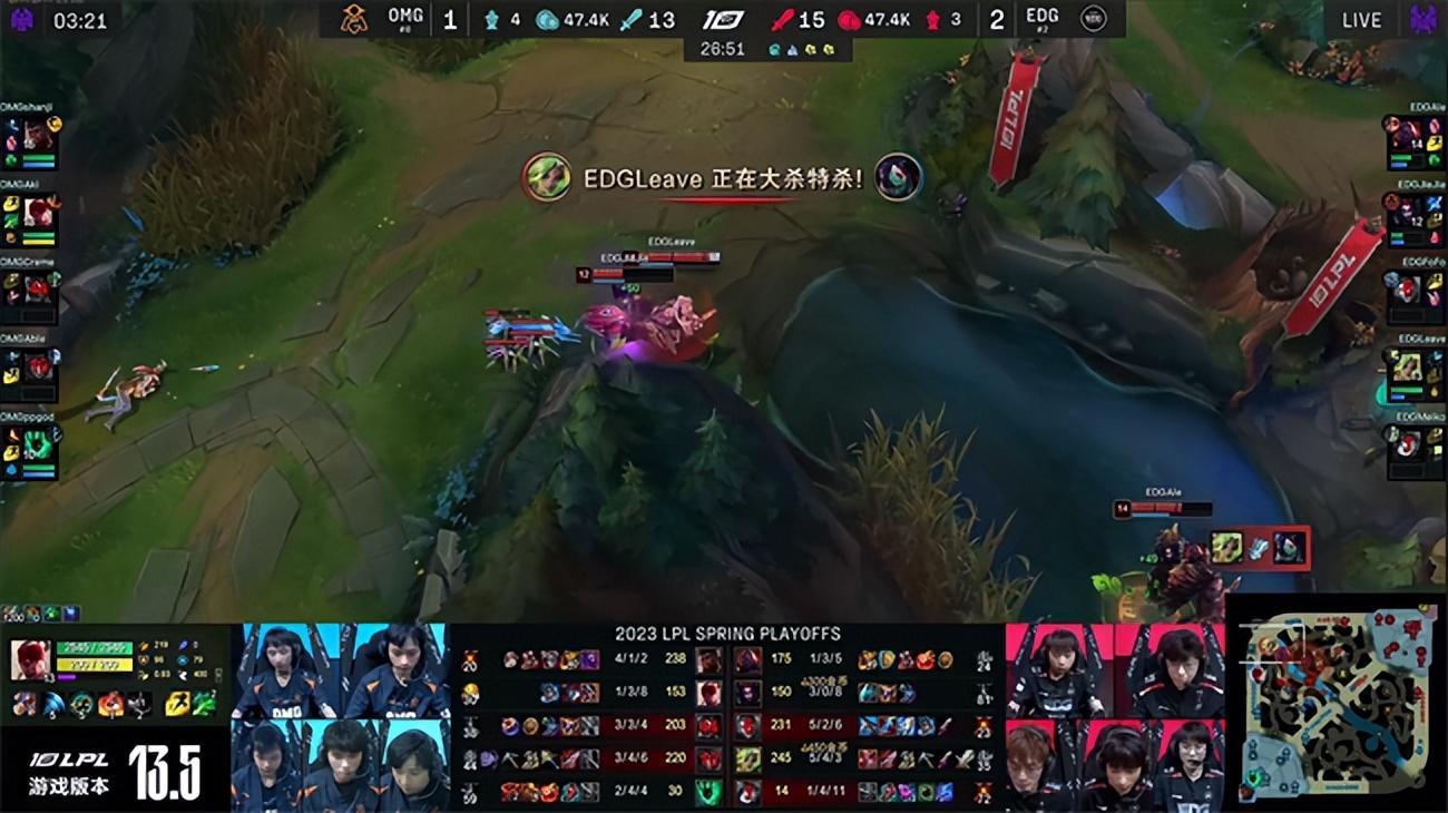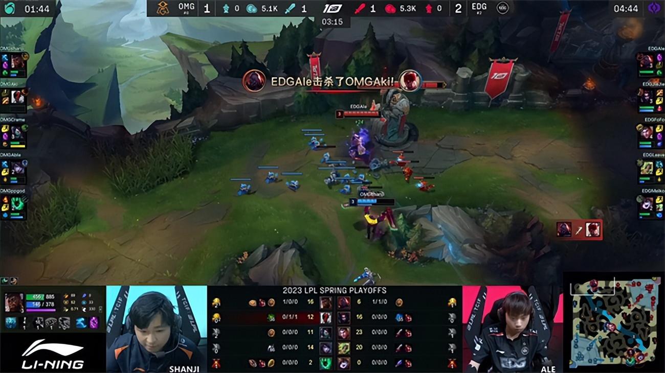 2023 LPL春季赛季后赛四强双败赛第一轮第二场对决,以常规赛第六身份一路黑马逆袭杀入四强的OMG战队即将迎来季后赛至今最为强大的对手EDG战队,两队都是历史渊源颇深的LPL老牌战队,如今在赛场相遇即将争夺晋级胜者组决赛的机会。而败者则将与BLG战队展开生死局较量。双方的硬实力与中期运营能力有所差距,但OMG强悍的团战操纵硬生生在第一局翻盘击败EDG先夺一分,EDG迅速冷静下来调整战术,开始主打下半区阻断OMG引以为豪的控龙打法,成功限制了OMG下路的发挥,最终实现让一追三,3-1战胜OMG挺进胜者组决赛。EDG将与JDG争夺第一张通往春季总决赛的门票。