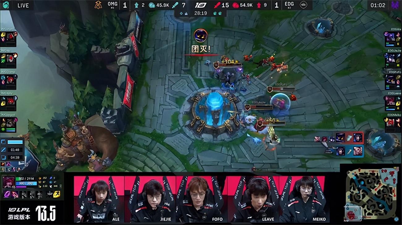 水龙魂刷新以后EDG占住河道方向想要抓住OMG的破绽打出控制链,但是OMG的拉扯配合非常完美,全员都保持着紧密的阵型不给任何机会,EDG无奈转火小龙,但奎桑提果断冲阵卖掉自己,给盲僧争取到空间抢到了水龙魂。水龙魂在手的OMG全员士气大振围绕霞一路疯狂追击输出,逐个击破斩杀EDG四人,再次赢下团战以后收掉第二条大龙实现双龙会,已经将主动权彻底掌握在了自己手中。