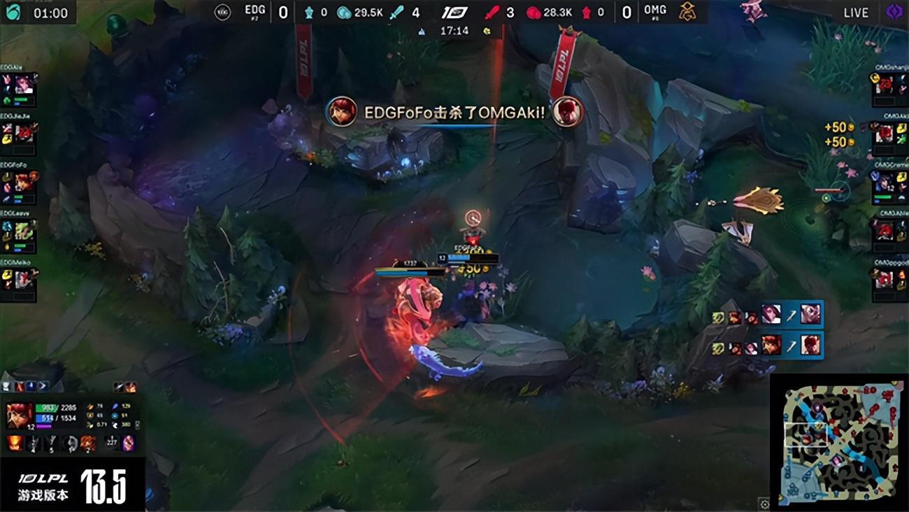 开局五分钟EDG三人包夹中路拿下了阿狸的一血,不久后猴子在河道被佛耶戈追杀,而OMG双人组还沉浸在下路对抗没有及时撤退,结果没有闪现的洛被EDG合力击杀,安妮赶到以后把泽丽压出一塔范围,阿狸前来掩护泽丽勉强吃到塔下兵线尽力挽回损失,OMG前期三条线都不同程度陷入被动。尽管努力在上半区尝试找回机会,可EDG的应对非常稳健,没有给到OMG太多机会。14分钟左右厄斐琉斯在OMG野区偷F6被发现以后遭到OMG众人的包夹追击,但是EDG援军赶到不懈地营救保护将厄斐琉斯惊险地带出了险地,凯南TP落地收下一波三杀,EDG打出0换4进一步扩大领先优势。