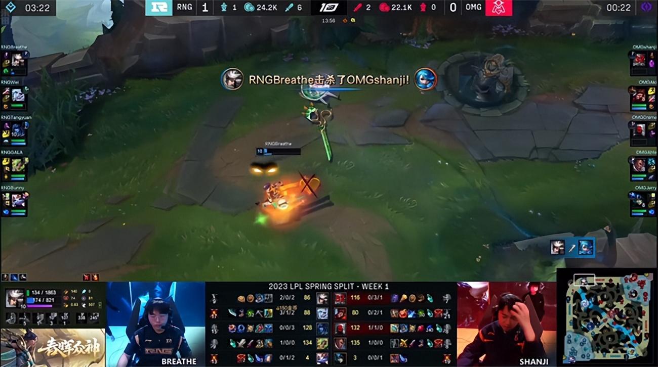 虽然OMG上、中两路手握线权,但RNG中野抓到对面回城的时间差,打完了峡谷先锋,OMG则带走了没有闪现的佛耶戈。Wei的佛耶戈节奏完爆猴子:先埋伏在小龙河道,和丽桑卓抓死了猴子,然后马不停蹄赶往上路,再次击杀了格温,放出先锋帮助青钢影推掉一血塔。12分钟青钢影长途跋涉赶往下路,RNG在小龙河道打出0换2,OMG中野双双阵亡节奏炸裂。Breathe的青钢影传送回上路,一路追击单杀了shanji的格温!