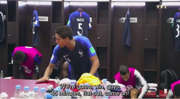 世界杯决赛中场休息时,瓦拉内给队友鼓劲