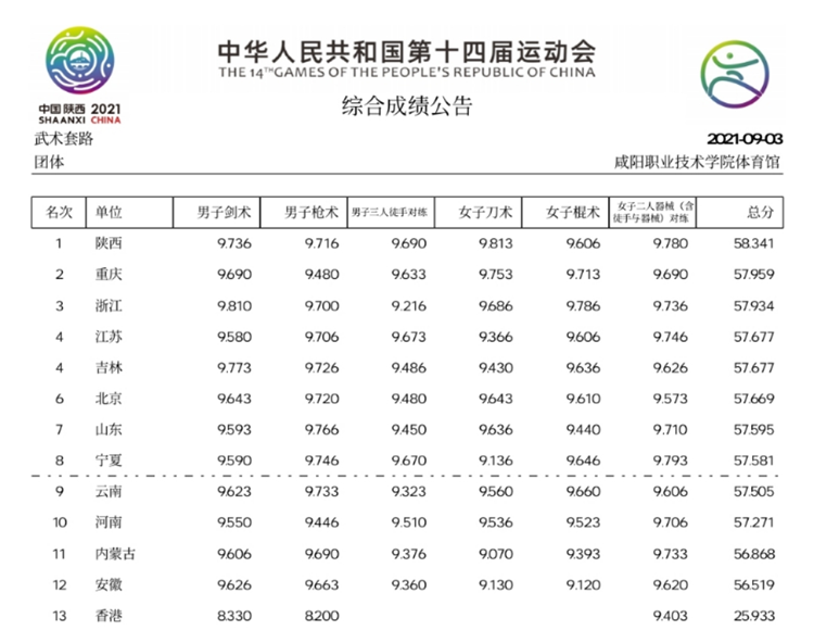 经过3个比赛日的较量,陕西队以58.341的总分摘得金牌。重庆队与浙江队分别以57.959和57.934的总分摘得银牌和铜牌。