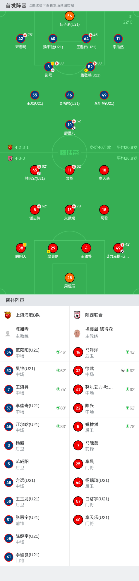 在中国足球乙级联赛决赛阶段的较量中,上海海港B队坐镇主场迎战陕西联合。比赛中,上海海港B队的廖重九在彭号的助攻下率先破门,为主队取得领先。然而,陕西联合迅速做出回应,钟玮宏助攻艾力库提-艾沙江扳平比分。随后,徐武为陕西联合再下一城,帮助球队反超比分。最终,陕西联合以2比1的比分战胜上海海港B队,取得了这场比赛的胜利。