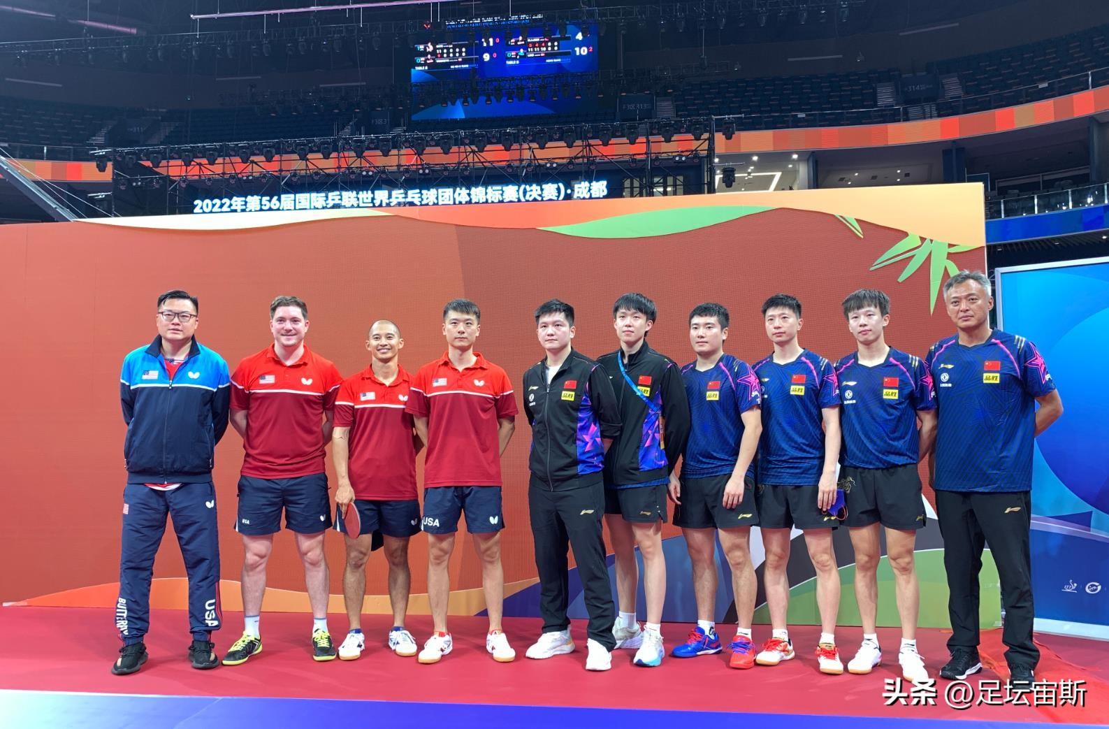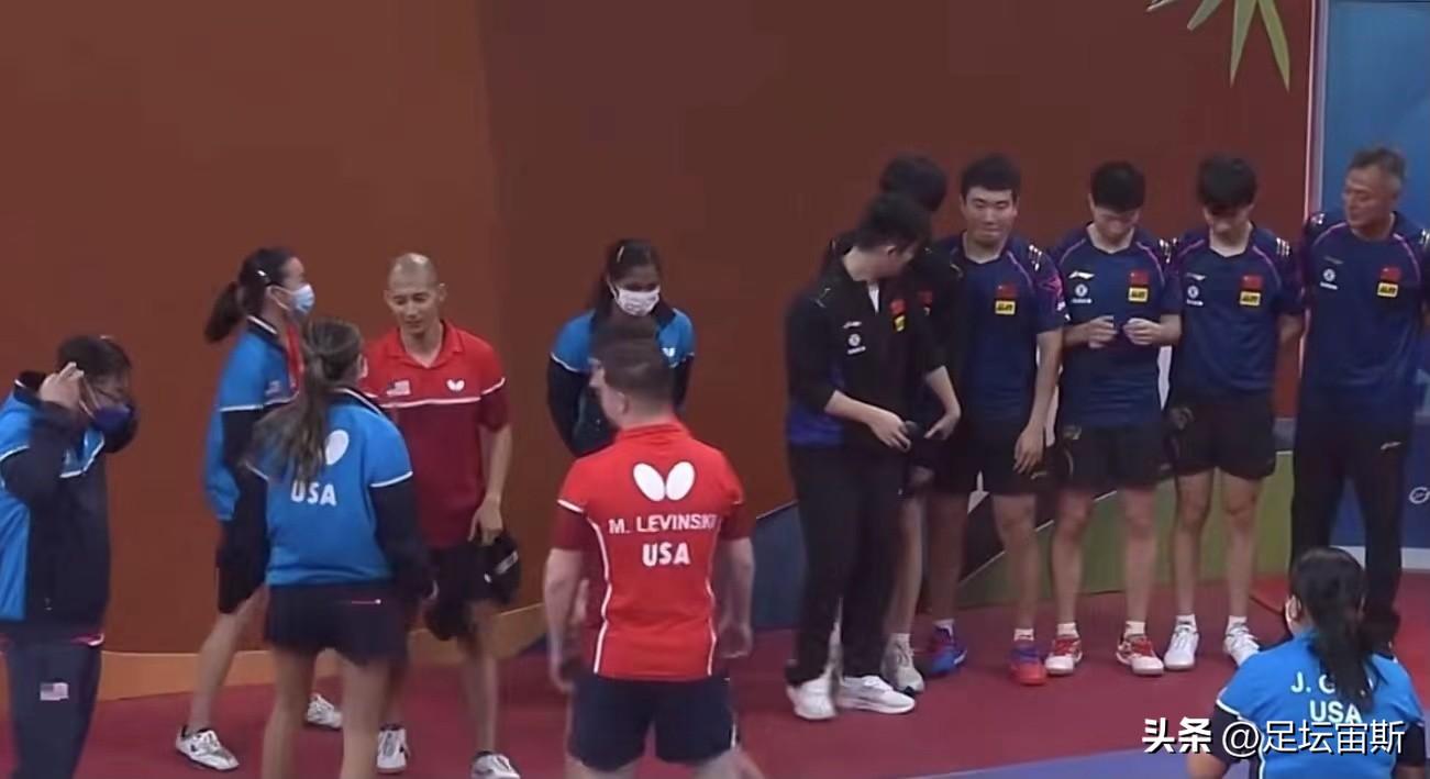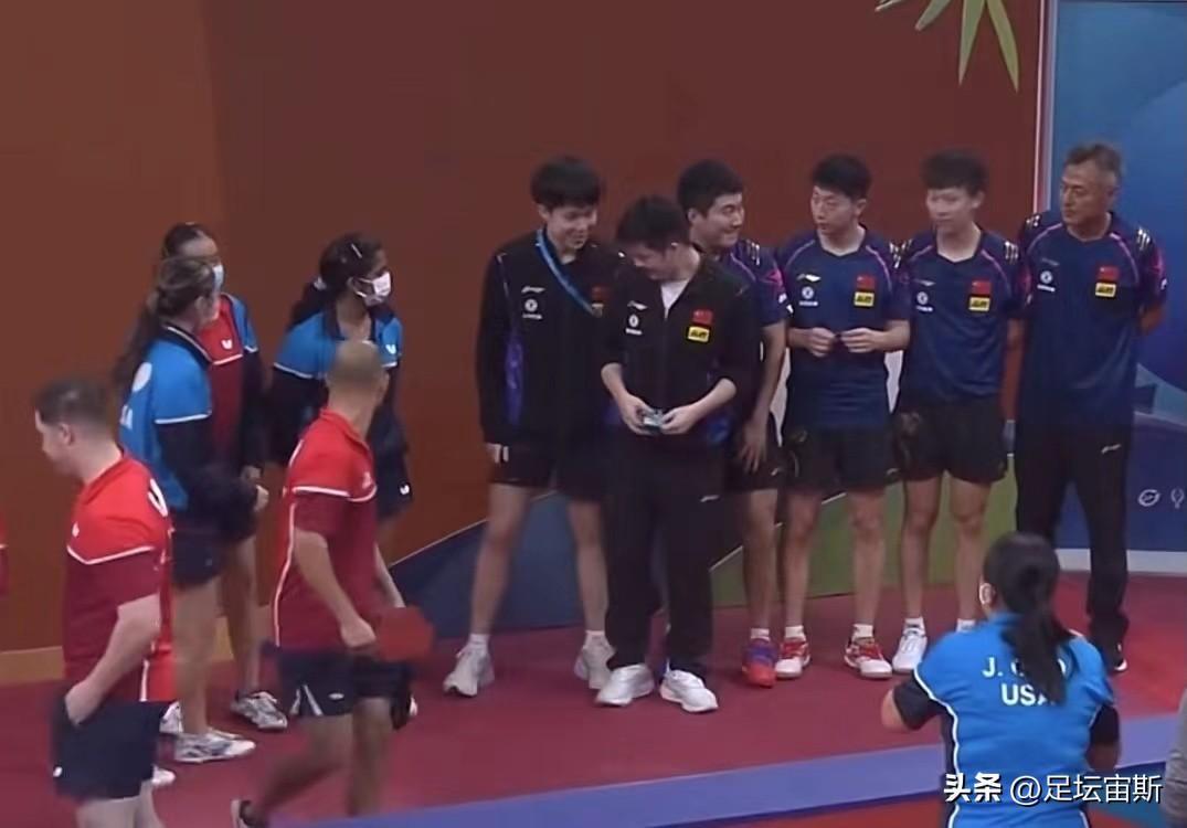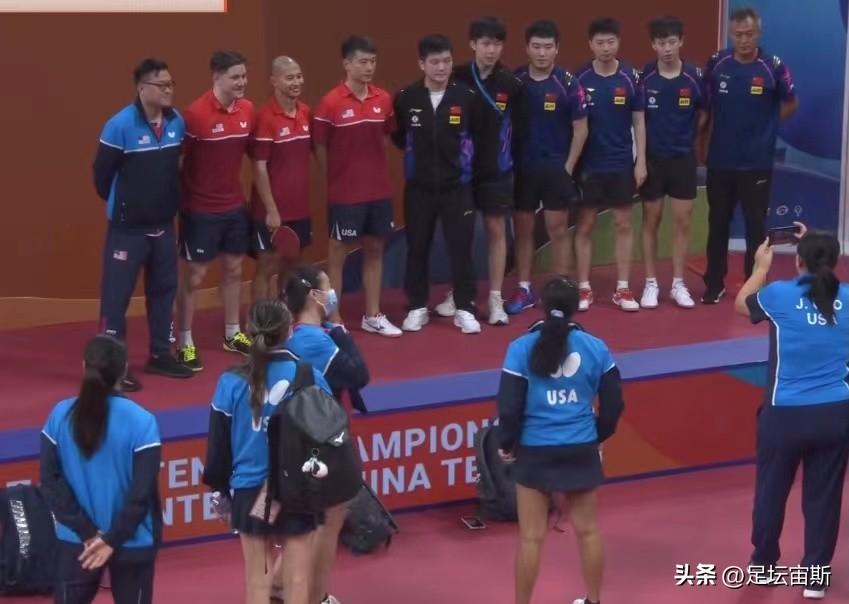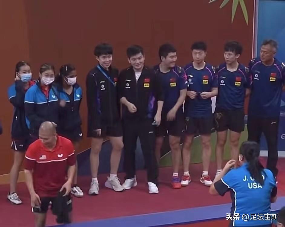 在比赛结束后,美国男女团的队员纷纷寻找国乒男团合影,中国男乒主帅秦志戬带着“五虎将”马龙、樊振东、王楚钦、梁靖崑、林高远参加了合影。秦志戬站在最边上,而排名世界第一的樊振东则和美国男队员挨着站一起。