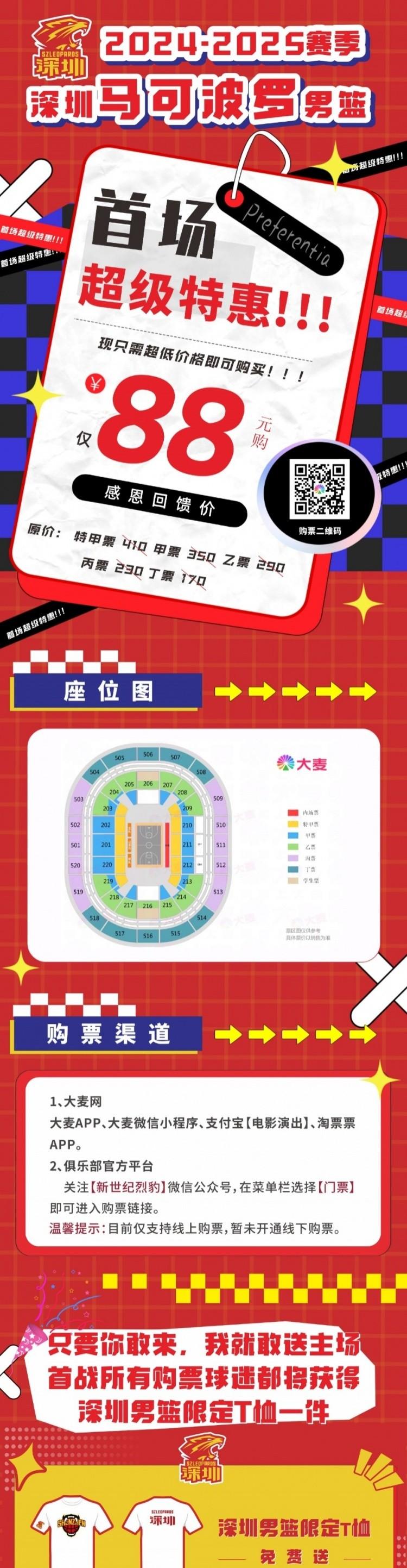 此前,深圳男篮官方发出消息,10月18日球队新赛季对阵江苏男篮的主场揭幕战,全价位门票仅售88元。