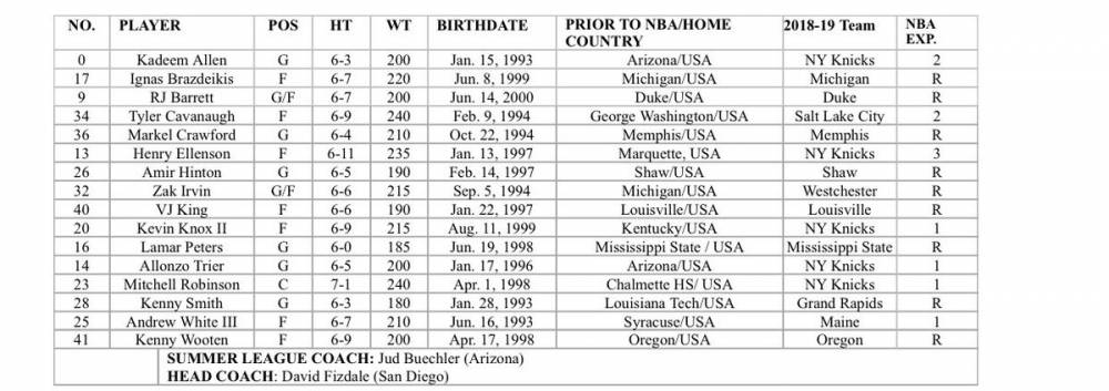直播吧7月3日讯 据著名纽约篮球记者Ian Begley报道,尼克斯公布了今年夏季联赛球队名单,其中包括今年探花秀RJ-巴雷特和去年9号秀诺克斯,主教练则是尼克斯助教贾德-彪克勒(Jud Buechler),具体如下: