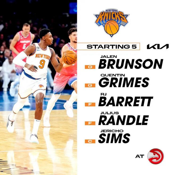 尼克斯官方更新推特,公布了球队今日的首发阵容。