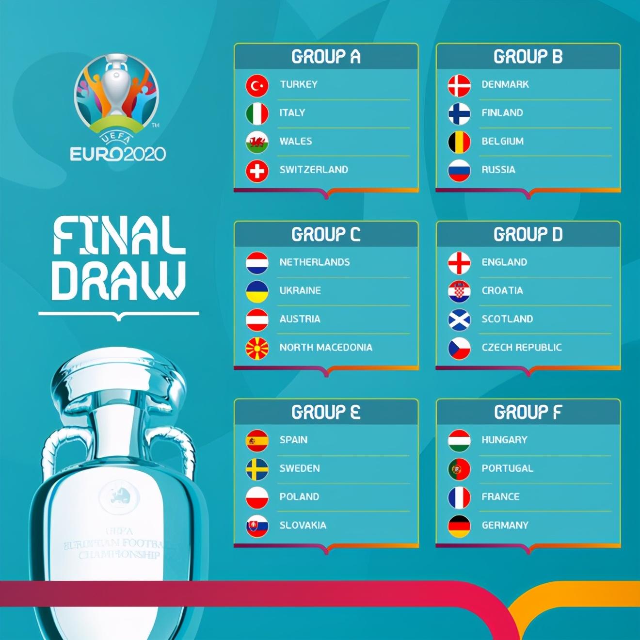 北京时间11月13日上午,欧足联也根据此前的分组抽签情况,公布了2020欧锦赛正赛的分组名单和各组比赛的举办地点,具体为: