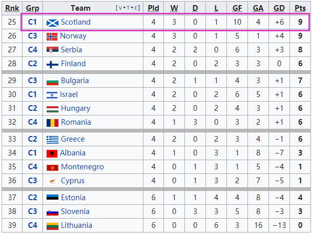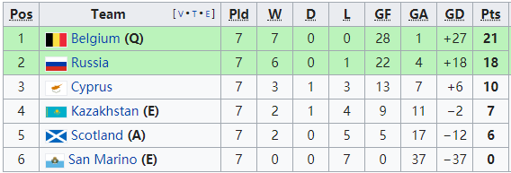 I组之中,7轮后积7分的哈萨克斯坦和积0分的圣马力诺已出局,但仅积6分的苏格兰却锁定附加赛席位。
