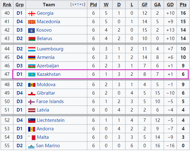 哈萨克斯坦在欧国联D档第三小组中排名第二,最终在D档排位第8。在同档白罗斯确定附加赛席位的情况下,即便格鲁吉亚、北马其顿、科索沃一起在预选赛出线,哈萨克斯坦也无法顺延得到参加附加赛的机会(5-7位顺延)。