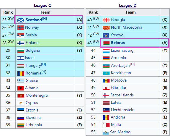 3、若这14个欧国联各级别小组第一均已经获得欧预赛小组前二,则根据欧国联55支球队的排名,将这2个参赛名额给欧国联小组赛排名靠前的球队。