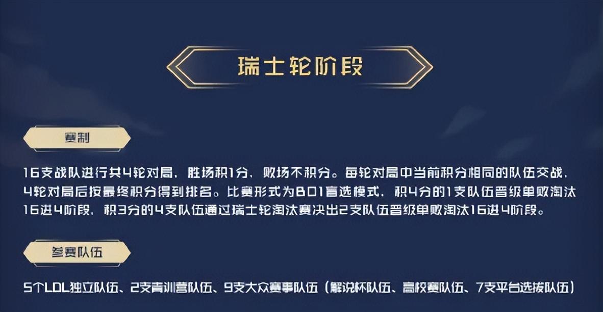 瑞士轮赛制从未出现在LOL任何赛事中,德杯是第一次,他更多的是作为CSGO的赛制规则,瑞士轮全程采用bo1,首轮所有队伍会进行一次交战,之后胜利的队伍进入一组,失败的队伍进入另外一组,重复整个过程让队伍越分越多,直到最后得分低的队伍淘汰,高的队伍则晋级。