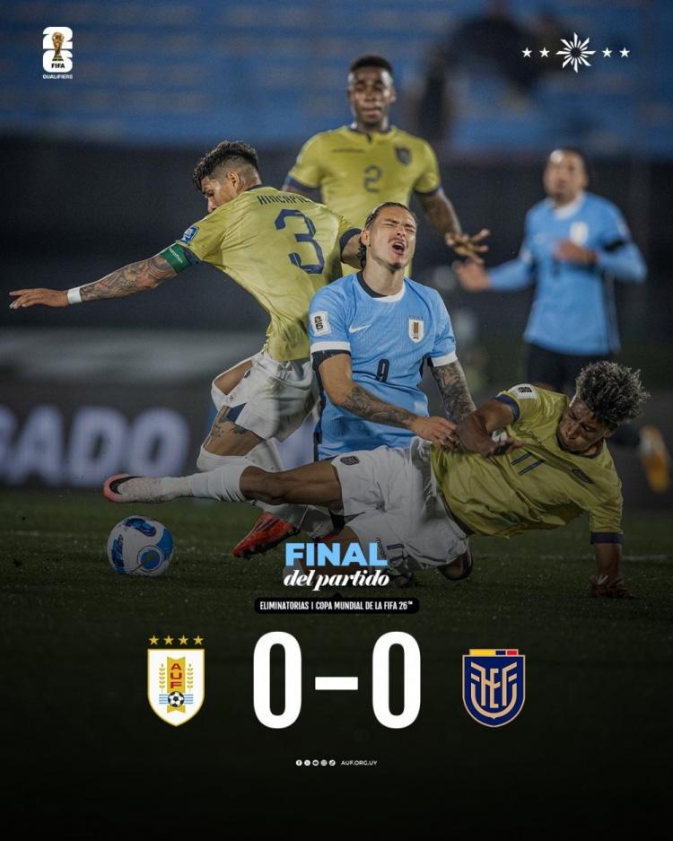 全场比赛结束,乌拉圭0-0厄瓜多尔。
