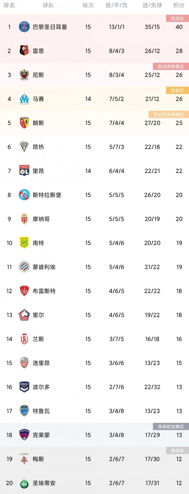 巴黎圣日耳曼积40分继续领跑,雷恩积28分位居次席,尼斯和马赛同积26分,朗斯积25分。