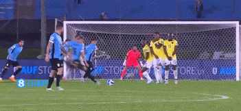第12分钟,乌拉圭禁区外围获得任意球机会,巴尔韦德主罚直接攻门,球绕过人墙后被门将扑出底线!↓