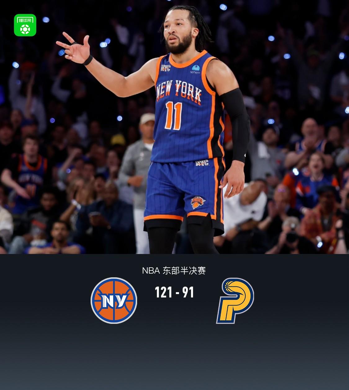 下半场开始步行者打出一波9-0缩小分差,布伦森顶住压力,带领球队回敬一波12-1,最终尼克斯121-91步行者拿下天王山,大比分3-2领先,全场比赛尼克斯拿下53个篮板,领先步行者24个!