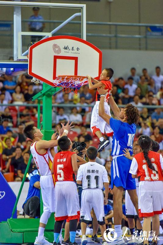 比赛第三节,由“姚基金希望小学篮球季”选拔出的小球员们分别在郭艾伦和NBA新奥尔良鹈鹕队球员贾克森·海耶斯的带领下,代表两队上场参赛。