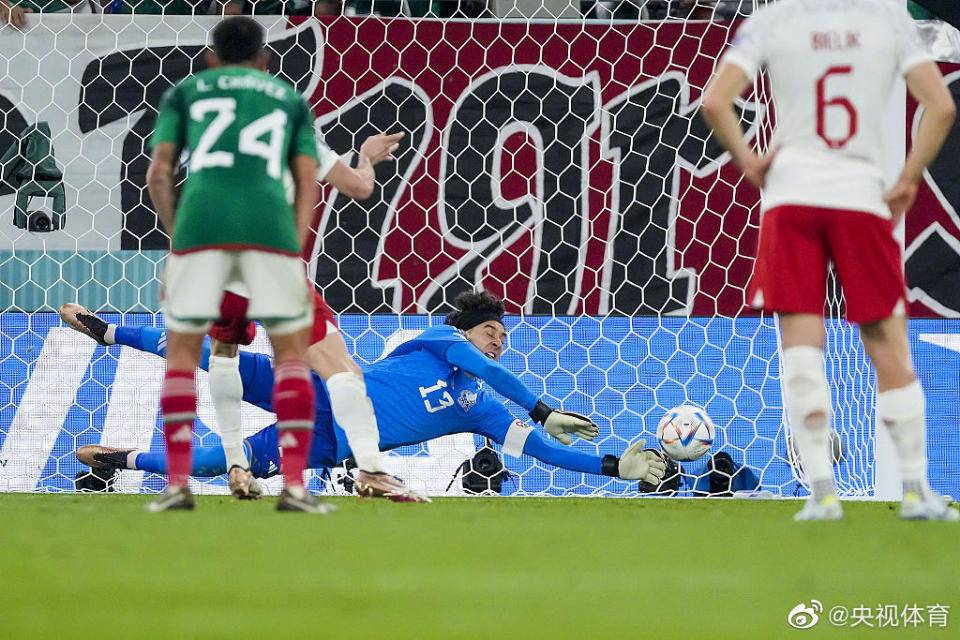 莱万多夫斯基的点球被墨西哥门神奥乔亚扑出,波兰队0:0墨西哥队。