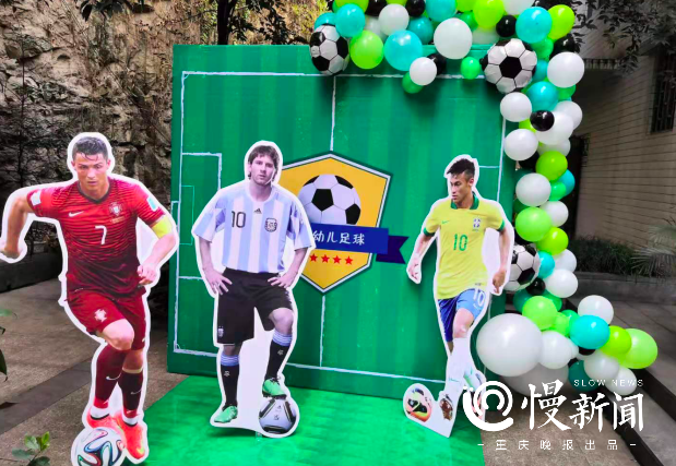 记者在今天的活动现场看到,足球氛围非常浓厚:不仅有曼联、切尔西、巴塞罗那等中国球迷耳熟能详的国外俱乐部队徽;还有梅西、C罗、内马尔的人形合影板;幼儿园大厅内甚至摆放了一个专供参赛小球员签名、留影的巨大足球。