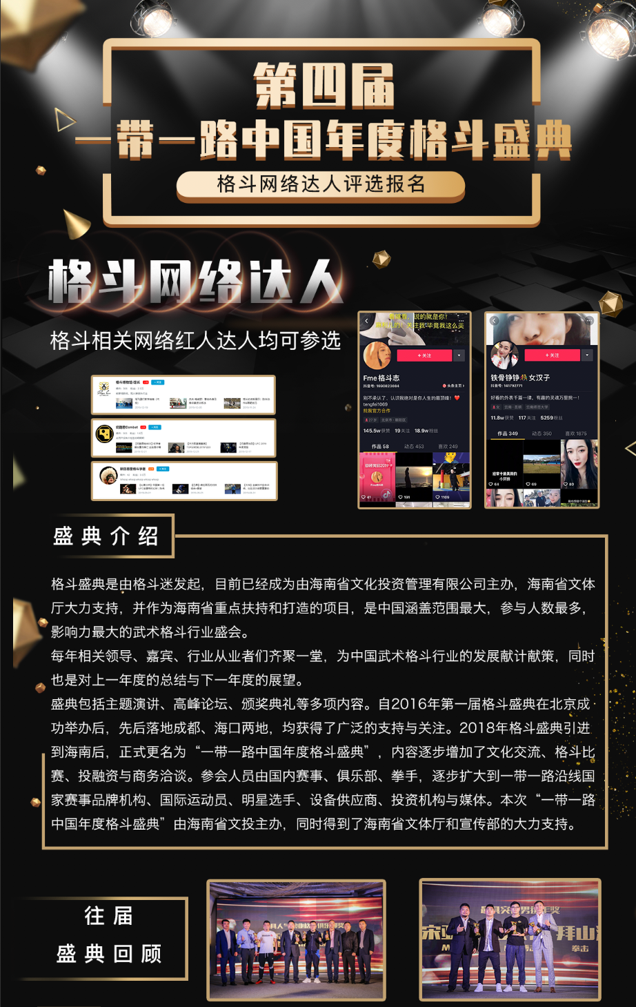 目前该奖项已经开启了海选报名征集环节,无论你在微博、抖音、快手还是其他平台,只要是一位武术、格斗类网络达人就可报名参加。