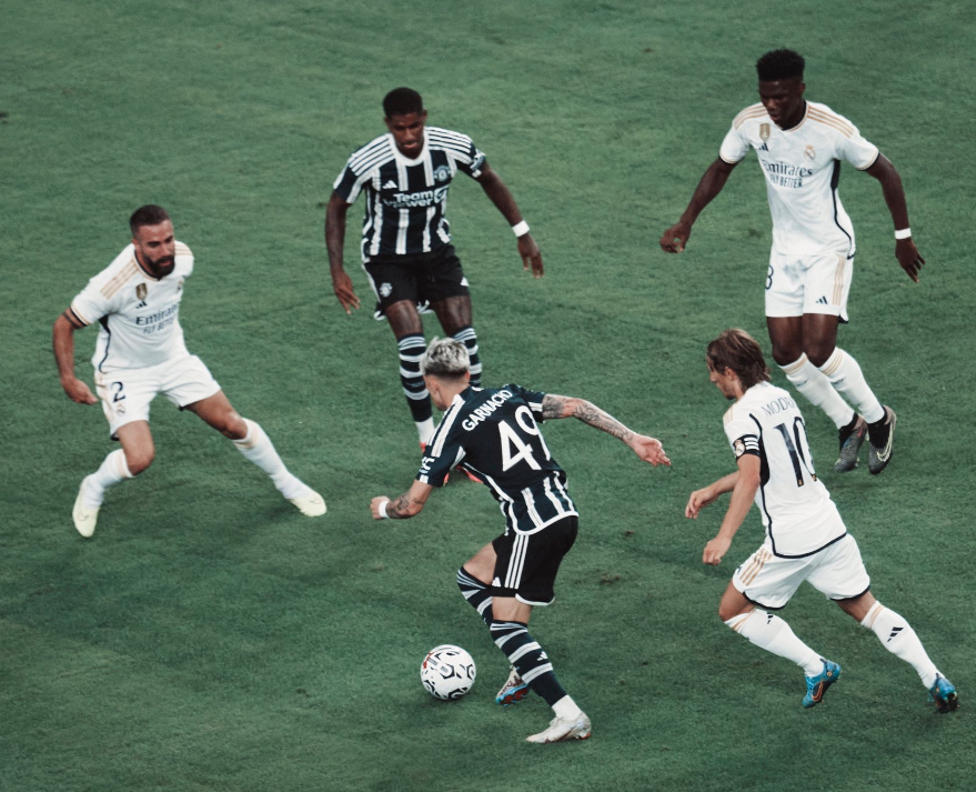 这是皇马今夏第2场热身赛,3天之前,皇马在洛杉矶玫瑰碗3-2逆转AC米兰。本场比赛,皇马排出韦尼修斯、罗德里戈、贝林厄姆的三叉戟,贝林厄姆踢伪9号。曼联方面,拉什福德单箭头,B费、芒特、加纳乔出任攻击型中场,奥纳纳镇守大门。