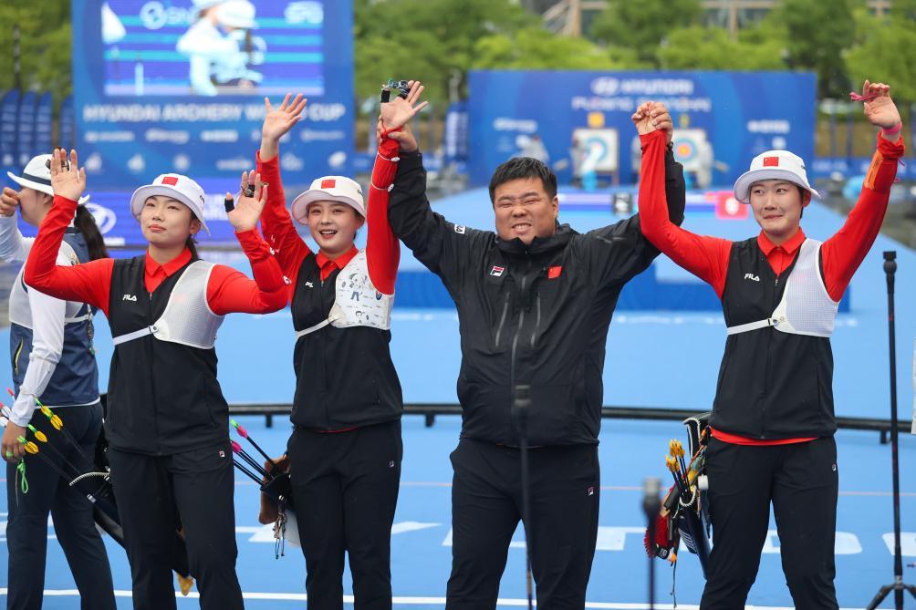 4月28日,在2024射箭世界杯赛上海站女子反曲弓团体决赛中,中国队击败韩国队夺得金牌。新华社记者 王翔 摄