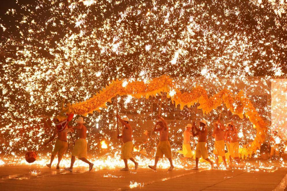 值得一提的是,除了激动人心的街舞大赛,还有一项双流区国家级非物质文化遗产——“黄龙溪火龙灯舞”进行展演,为整个活动增色不少。高温铁水“绽放”在空中,将夜空照耀得绚丽夺目,火树银花漫天飞舞,那舞龙身上的流苏在微风中徐徐飘动,舞龙者体态矫健,一条条金色长龙翻腾起舞,市民游客的欢呼声和身后的民乐声此起彼伏,好不热闹。